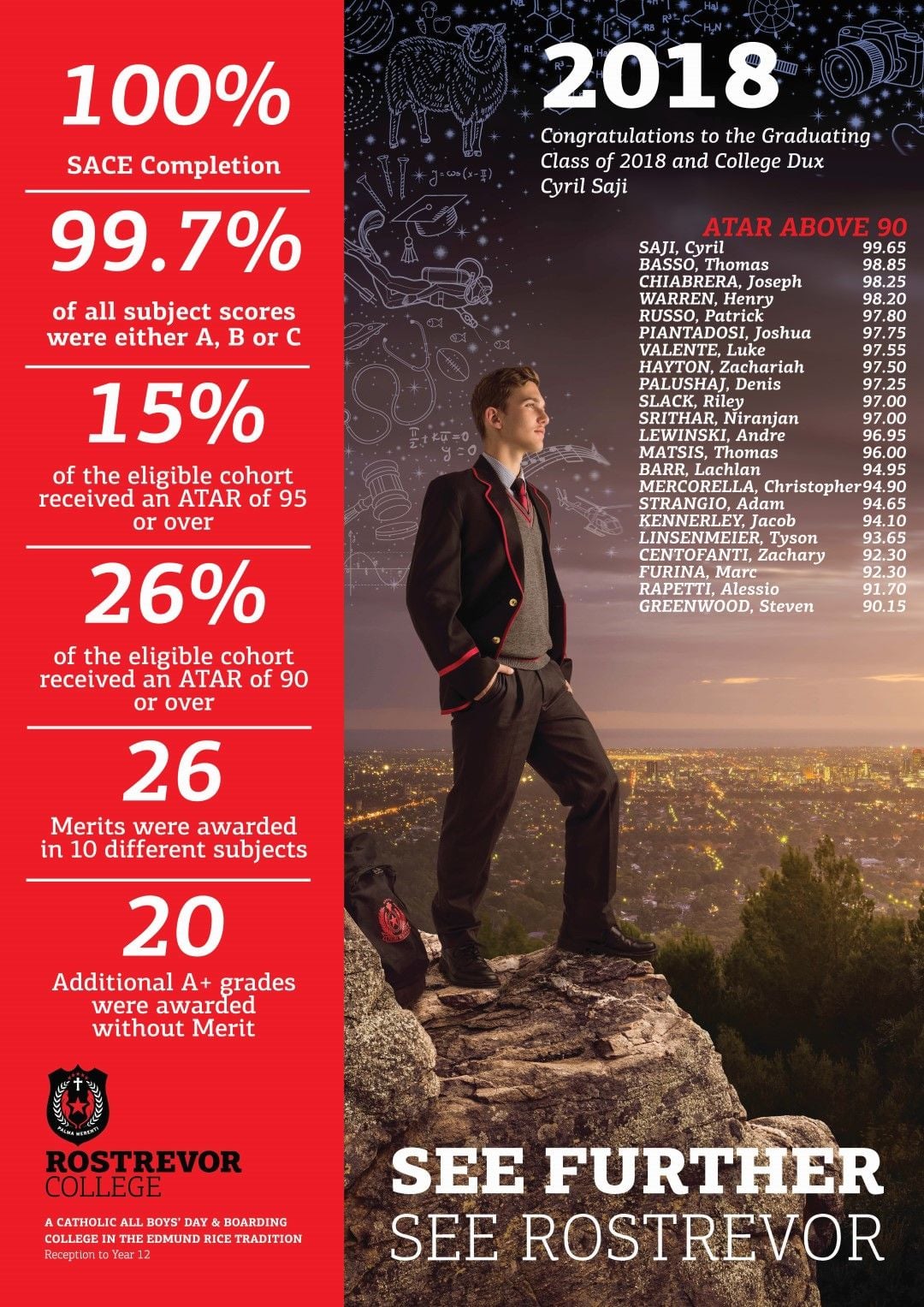 Rostrevor is thrilled to announce 100% SACE completion again in 2018 with 26% of eligible students attaining ATAR's above 90.00 and an incredible 15% achieving above 95.00 Special mention goes to dux Cyril Saji on his ATAR of 99.65, with merits in Research Project, English Literary Studies, Integrated Learning - RE and Psychology. The result caps off a great year for the Deputy Head Prefect who has contributed so much to the College. Well done, also, to Proxime Accessit Thomas Basso (98.85 ATAR and merits in English and Integrated Learning - RE).