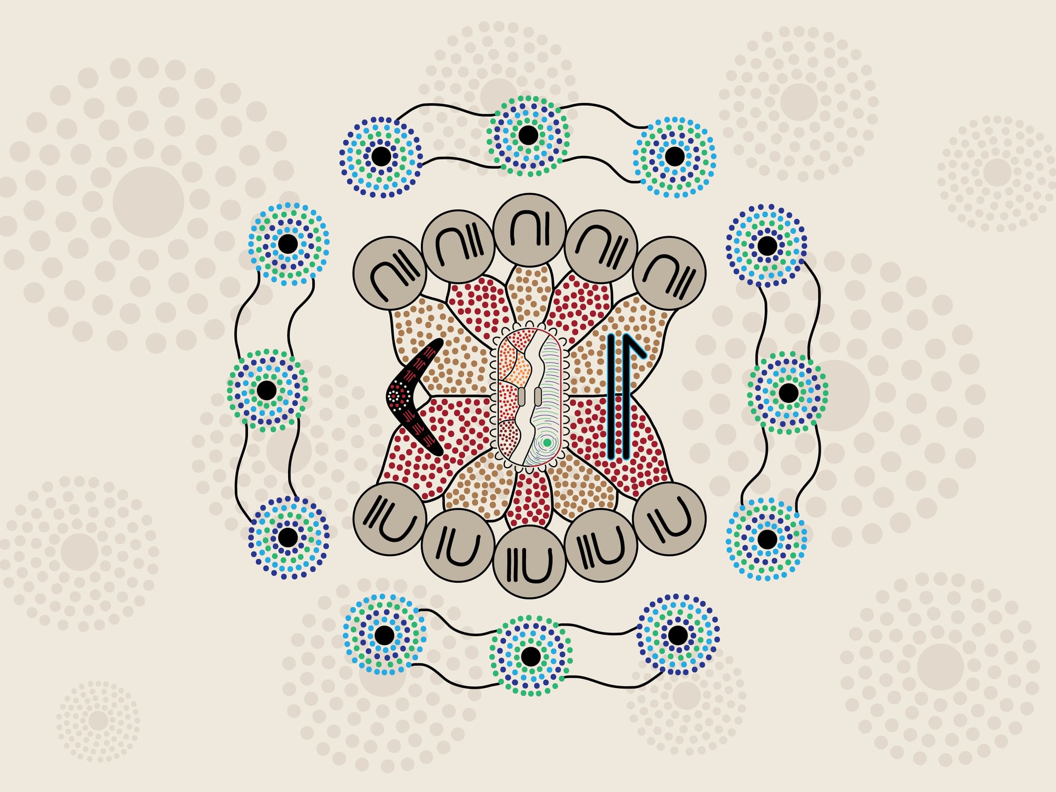“I used dark, earthy colours to represent my Central Australian family―the Arrernte people of Alice Springs, and aquatic colours for my Kimberley side―the Yawuru people of Broome. The boomerang, shield and spear at the centre of the artwork are symbols that represent the strength and courage that Rostrevor instils in its students, turning boys into young men and setting us up for the future.